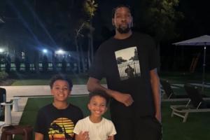 KD在火箭的老熟人!DJ-奥古斯汀晒俩儿子和杜兰特合影:杜叔叔