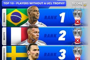 无欧冠球员TOP10:大罗居首 姆巴佩、伊布、阿圭罗、凯恩列2至5位
