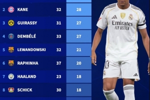 2025年五大联赛射手榜:姆巴佩37场35球居首,凯恩32场28球次之