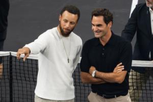 都好帅!库里与费德勒合影 还对着大通中心某处指指点点~