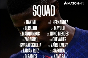 巴黎对马赛名单:K77领衔,登贝莱、杜埃、内维斯、巴尔科拉缺席
