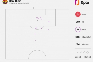奥尔莫本赛季西甲11次射门未破门,仅两名未破门球员射门次数更多
