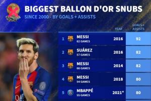 无缘金球年份最高进球+助攻数据榜:前4梅西占3席 C罗3度上榜