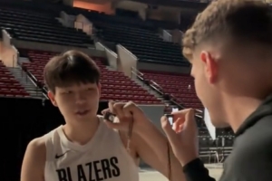 哈哈!新赛季媒体日克林根和杨瀚森拿着微型相机互拍