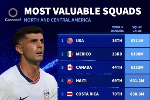 中北美国家队身价榜:美国3.11亿欧居首,墨西哥位列次席