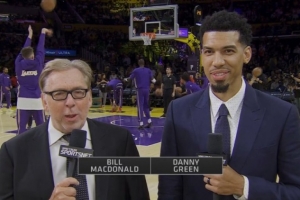 体育资讯10月13日讯 今日前NBA球员、现湖人电台Spectrum SportsNet解说员丹尼-格林现场解说湖人VS勇士的季前赛。