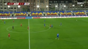 上半场比赛,安道尔球员洛佩斯打进一粒精彩的超远吊射,他在中圈附近抢断后起脚吊射,塞尔维亚门将,现效力于伯恩茅斯的佩特洛维奇因站位靠前未能扑出皮球。