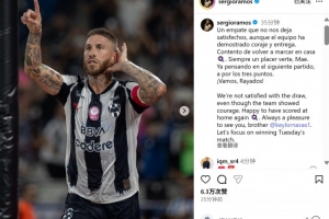 本场比赛拉莫斯点射攻破前皇马队友纳瓦斯把守的球门,赛后拉莫斯社媒晒照写道:“尽管球队展现出了勇气,但我们对平局并不满意。很高兴再次在主场取得进球 。见到你总是很开心,我的兄弟纳瓦斯。让我们专注于赢得周二的比赛。”