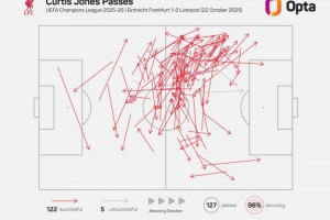 琼斯成功传球122次,创造03-04赛季以来利物浦欧冠单场纪录