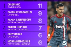 本赛季欧冠精准传中榜:奇奎尼奥11次第一,索博斯洛伊9次第二
