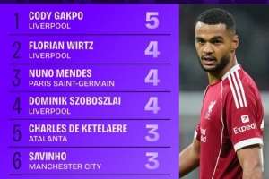 本赛季欧冠创造绝佳机会榜:加克波5次第一,维尔茨等3人4次