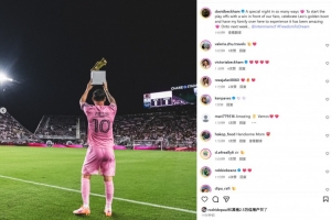 本场赛前梅西领取了常规赛金靴奖杯,贝克汉姆也在社媒晒出梅西捧杯照片,配文写道:“从很多方面来讲今天都是特殊的一天,在我们主场球迷面前以一场胜利开启季后赛,庆祝梅西获得金靴奖,还有家人们来到现场观赛。我们下周继续加油。”