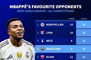 姆巴佩生涯进球最多球队前十:唯一非法国球队就是巴萨 9场轰12球