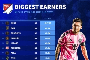 德转列美职联薪资:梅西1770万欧断层居首,孙兴慜970万欧次席