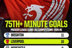 体育资讯10月31日讯 数据机构OPTA统计了英超球队本赛季各项赛事在75分钟后的进球情况,布莱顿力压利物浦居首。