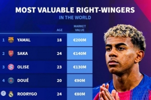 右边锋德转身价榜:亚马尔2亿欧居首,萨卡第二,奥利塞第三
