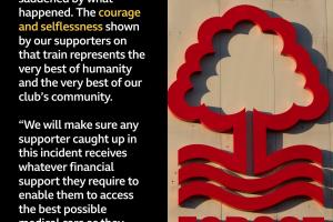 俱乐部老板马里纳基斯表示:“诺丁汉森林全体成员对发生的悲剧感到震惊和深切悲痛。我们的支持者在列车上展现的勇气和无私,体现了最崇高的人性光辉和最宝贵的俱乐部社区精神。”