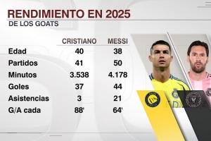 梅罗今年数据:梅西50场44球21助,C罗41场37球3助