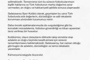 俱乐部正密切关注事件细节,静待整个流程完成以确保正义得到最公正的彰显。加拉塔萨雷始终如一地站在正义、诚信与公平竞争的一边。谨此向公众郑重宣告。