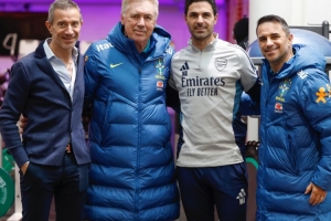 巴西队在阿森纳基地训练,安切洛蒂与阿尔特塔合影