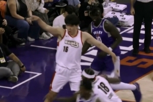 难受啊~杨瀚森被好兄弟马卢阿奇干扰球 向裁判申诉但没吹罚