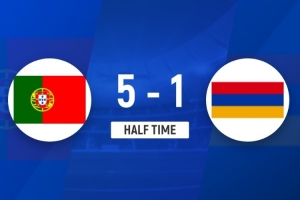 半场-葡萄牙5-1亚美尼亚 内维斯任意球世界波+双响 B费点射破门