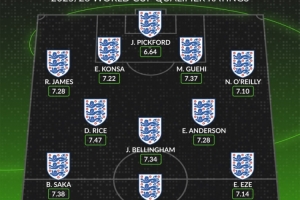 WhoScored英格兰世预赛评分最高阵:凯恩、赖斯、萨卡分列前三