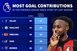 上赛季至今英超参与进球榜:萨拉赫53球居首,哈兰德40球次席