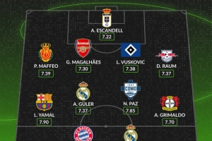 体育资讯11月19日讯 WhoScored根据球员的场均评分,列出了本赛季至今五大联赛最佳阵容,姆巴佩、凯恩、亚马尔在列。