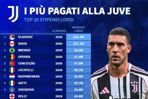 尤文税前年薪排名:弗拉霍维奇2220万欧居首,戴维1110万欧次席